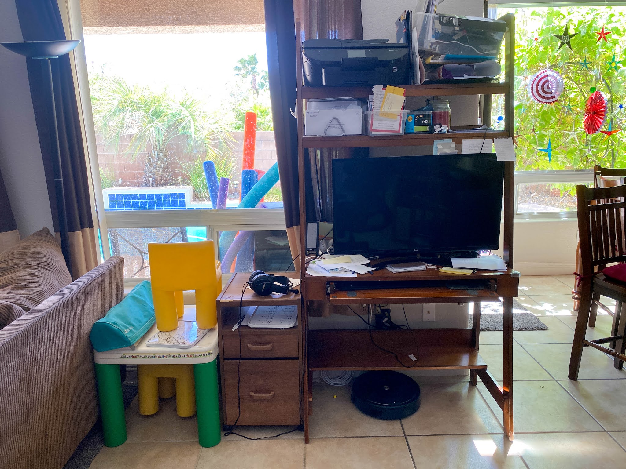 We needed a little project since we were home so often. So I asked Garry if he could make me some stuff for my craft room. We also decided that we wanted a new desk. We had just outgrown this one and we were getting a new computer with our stimulus check money and it was going to have two monitors, so they were both not going to fit. We ordered our new desk from IKEA and Garry used some old IKEA wood we had in the garage to make me a standing desk for the craft room. We also added a shelf to the configuration by the window in the craft room to hold the TV and free up my bottom shelf again. These are the before and afters of the whole thing. The standing desk in the craft room was built over the guest bed. Garry added a head and foot board and the desk is removable for when we have company. I love his skill and willingness to make me things I see and want!