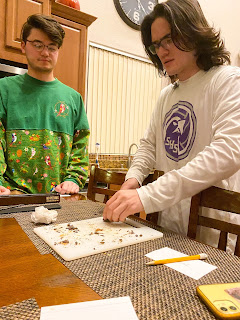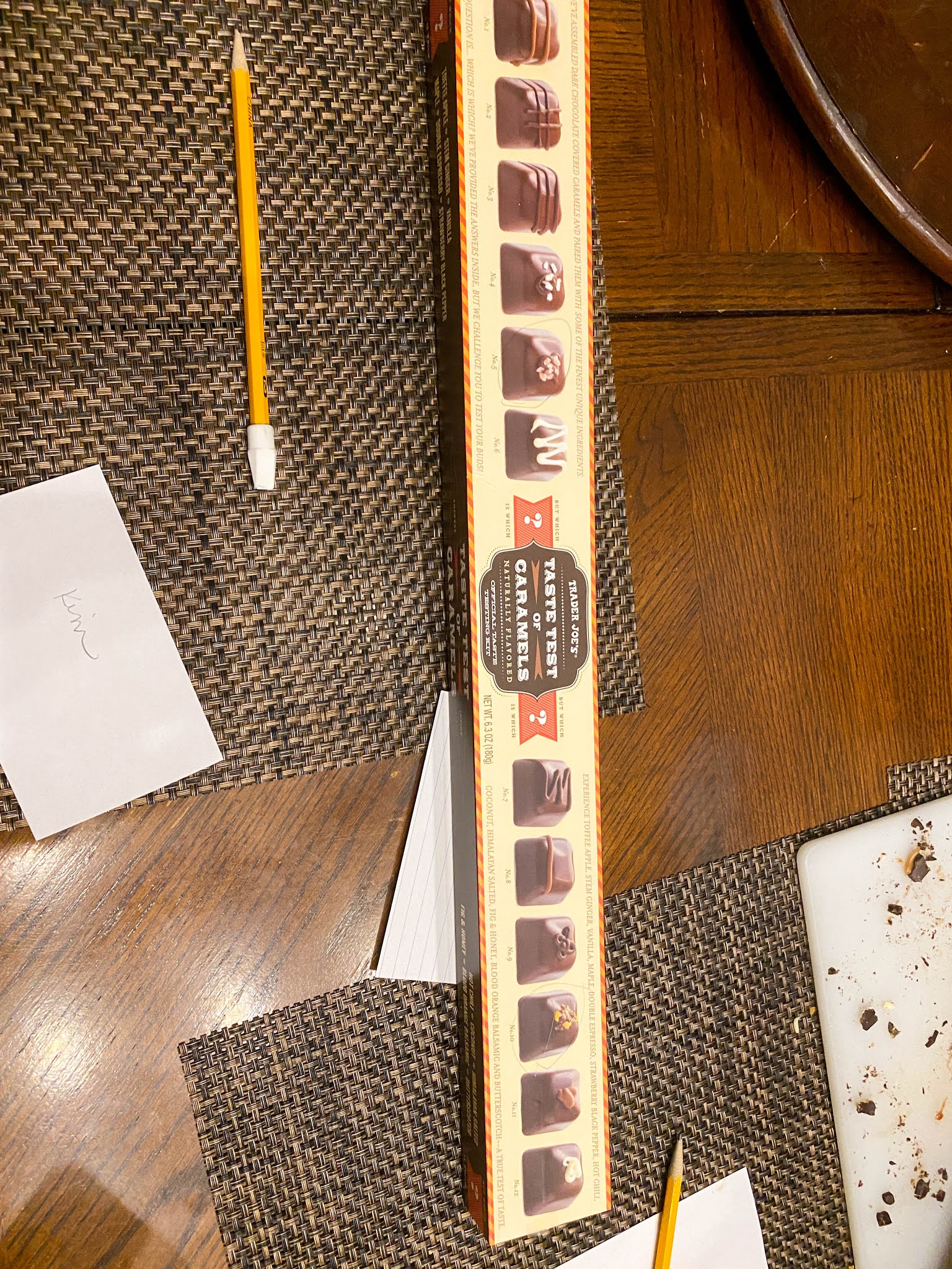 Our friends, the Witt's (Bill is our Minister) got us a chocolate game for Christmas. It ended up being super fun. They got it at Trader Joe's and it had 12 chocolates in it. Me, Garry, Tanner, Taz and Cynjyn tried it one night. We cute the small piece of chocolate into 6th's and each had a taste. The flavors were on the top and so we all had a three by five note card to put our guesses on. The flavors were weird like blood orange, balsamic vinegar and strawberry etc. Cynjyn and Garry ended up guessing the most correct with 7 out of 12.